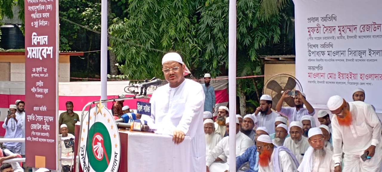 ইসলামী আন্দোলন বাংলাদেশের আমীর মুফতী সৈয়দ মুহাম্মদ রেজাউল করিম পীর সাহেব চরমোনাই বলেছেন, আমরা যারা দেশ প্রেমিক আমরা যদি একত্রিত হয়ে দেশের পক্ষে ইসলামের পক্ষে মানবতার পক্ষে আওয়াজ তুলতে পারি তাহলে হক আসবে বাতিল দূর হবে আলো আসবে অন্ধকার দূর হবে। আমরা দেশ প্রেমিকরা যদি আওয়াজ তুলতে পারি তাহলে ক্ষমতাপ্রেমিরা দেশ ছেড়ে পালাতে বাধ্য হবে। একারনে আমরা সকলকে আহবান জানাবো আসেন আমরা সবাই সেই আশা আকাঙ্খা নিয়ে কাজ করি। আপনারা দেখছেন ৫ আগস্টের পরে ইসলামের পক্ষে বাংলাদেশের মানুষের একটা হৃদ্যতা সৃষ্টি হয়েছে সেটাকে আমাদের কাজে লাগাতে হবে। এজন্যই আমরা ঘোষণা করেছি ইসলামের পক্ষে আমরা চেষ্টা করতেছি একটা বাক্স পাঠানো যায় কিনা। আল্লাহর রহমতে সেই প্রক্রিয়ায় আগাচ্ছি, এগিয়ে গেছি এখন আপনাদের সহযোগিতা থাকা লাগবে। আমার ভাই বোনদের কাছে মা বোনদের কাছে দেশ গড়ার লক্ষে ইসলামের মর্মতার পক্ষে যদি দাওয়াত দিয়ে যেতে পারি আমার মন বলছে এদেশে আগাছা মাথা চাড়া দিয়ে দাড়াতে পারবে না।