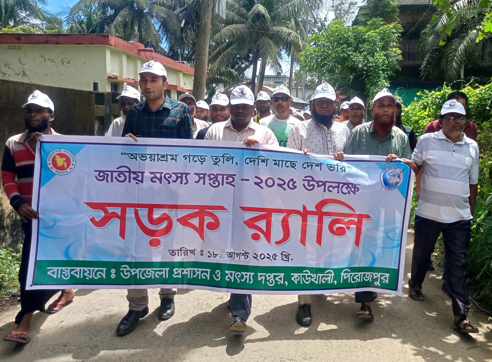 পিরোজপুরের কাউখালী উপজেলা প্রশাসন ও মৎস্য অধিদপ্তরের আয়োজনের সোমবার (১৮ আগস্ট) বেলা এগারোটায় অভয়শ্রমে গড়ে তুলি, দেশি মাছে দেশ ভরি এই প্রতিপাদ্যকে সামনে রেখে উপজেলা পরিষদ চত্বর থেকে কাউখালী উপজেলা নির্বাহী কর্মকর্তা সজল মোল্লার নেতৃত্বে একটি বর্ণাঢ্য শোভাযাত্রা উপজেলার বিভিন্ন গুরুত্বপূর্ণ সড়ক প্রদক্ষিণ শেষে সন্ধ্যা নদীর তীরবর্তী লঞ্চঘাটে এক আলোচনা সভা অনুষ্ঠিত হয়। শোভাযাত্রায় অংশগ্রহণ করেন, মৎস্য কর্মকর্তা হাফিজুর রহমান, কৃষি কর্মকর্তা সোমা রানী দাস, প্রাণী সম্পদ কর্মকর্তা সোমা সরকার, সমবায় কর্মকর্তা অহিদুজ্জামান খান, কাউখালী থানার ইন্সপেক্টর( তদন্ত) ইবাদ আলী মোল্লা, সদর ইউনিয়ন পরিষদের চেয়ারম্যান মোস্তাফিজুর রহমান প্রমুখ। পরে উপজেলা মৎস্য কর্মকর্তা মোহাম্মদ হাফিজুর রহমানের সভাপতিত্বে আলোচনা সভায় প্রধান অতিথি হিসেবে বক্তব্য রাখেন ,উপজেলা নির্বাহী কর্মকর্তা সজল মোল্লা। আলোচনা সভায় অন্যান্যের মধ্যে বক্তব্য রাখেন, কাউখালী থানার ইন্সপেক্টর তদন্ত এবাদ আলী মোল্লা, মৎস্য নেতা আব্দুল জলিল, মোতালেব হাওলাদার প্রমুখ। আলোচনা শেষে পাঁচজন চাষীকে প্রত্যেককে পাঁচ কেজি করে মাছের পোনা পুরস্কার দেওয়া হয়। এছাড়া সন্ধ্যা নদীতে ৩০ কেজি রুই জাতীয় মাছ অবমুক্ত করা হয়।
