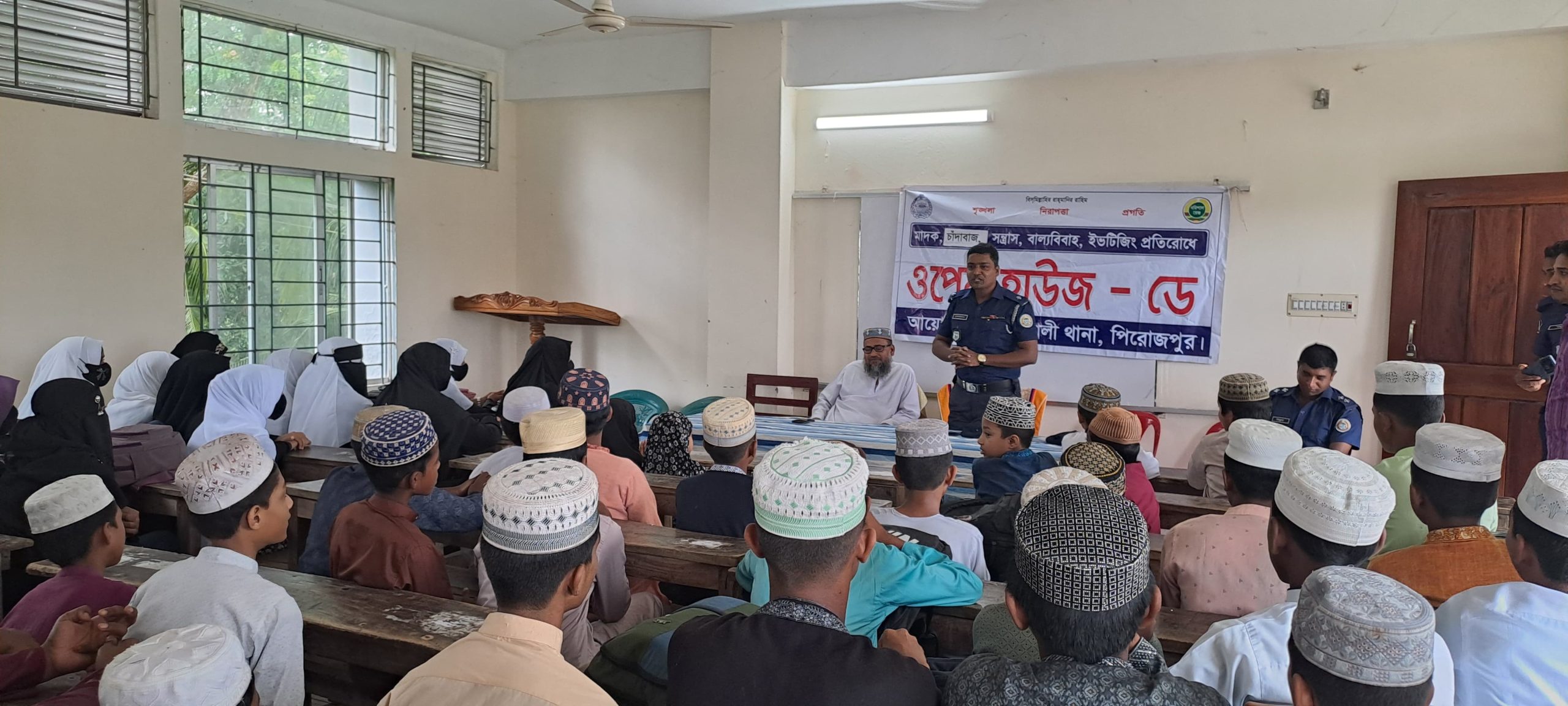 পিরোজপুরের কাউখালী থানা পুলিশের আয়োজনে মঙ্গলবার বেলা সাড়ে এগারোটায় কাউখালী কেন্দ্রীয় ফাজিল (ডিগ্রী) মাদ্রাসার হলরুমে শিক্ষার্থীদের নিয়ে বাল্যবিবাহ ও ইভটিজিং সংক্রান্ত সচেতনতা সৃষ্টির লক্ষ্যে এক মতবিনিময় সভা অনুষ্ঠিত হয়। কেন্দ্রীয় ফাজিল মাদ্রাসার অধ্যক্ষ মাওলানা হোসাইন আহমেদের সভাপতিত্বে অনুষ্ঠানে প্রধান অতিথি হিসেবে উপস্থিত থেকে বক্তব্য রাখেন, কাউখালী থানার অফিসার ইনচার্জ (ওসি) মোঃ সোলায়মান। এ সময় বক্তব্য রাখেন, মাদ্রাসার উপাধ্যক্ষ মাওলানা মোঃ জামাল হোসেন, শিক্ষার্থী মাহফুজা আক্তার রশনি, মাইশা আক্তার প্রমুখ। অনুষ্ঠানের সঞ্চালনের দায়িত্ব পালন করেন কাউখালী থানার এসআই বিপ্লব বিশ্বাস। আলোচনায় কয়েকজন শিক্ষার্থী তাদের মতামতে বলেন মাদ্রাসায় আসা-যাওয়ার পথে কিছু বখাটে ছেলে উগ্র আচরণসহ বিভিন্ন প্রকারের কুপ্রস্তাব দেয়। আলোচনায় উপস্থিত সকল শিক্ষার্থী একমত পোষণ করেন যে তাহারা বাল্যবিবাহ থেকে দূরে থাকবে। বাল্যবিবাহ প্রতিরোধে সকল প্রকার সহযোগিতা করবে। অনুষ্ঠানে প্রধান অতিথি ওসি মোঃ সোলায়মান বলেন, কোন শিক্ষার্থীকে যদি বখাটে ছেলেরা উৎপাত করে তাহলে পুলিশকে জানালে পুলিশ আইনগত ব্যবস্থা গ্রহণ করবে। শিক্ষার্থীদের উদ্দেশ্যে আরো বলেন তোমরা নিয়মিত বিদ্যালয় আসা-যাওয়া করবে, লেখাপড়া করে মানুষের মত মানুষ হও। বাল্যবিবাহকে এড়িয়ে চলবে।