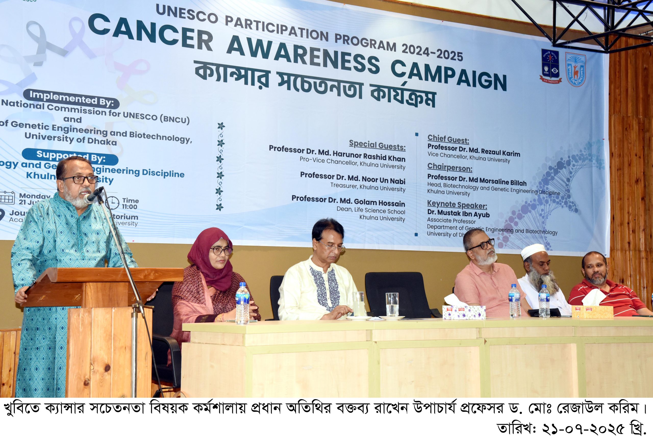 কর্মশালার উদ্বোধনী অনুষ্ঠানে প্রধান অতিথি হিসেবে বক্তব্য রাখেন খুলনা বিশ্ববিদ্যালয়ের উপাচার্য প্রফেসর ড. মোঃ রেজাউল করিম। তিনি বলেন, বর্তমানে সমাজে এক ভয়াবহ ব্যাধির নাম ক্যান্সার। এর চিকিৎসা অত্যন্ত ব্যয়বহুল। সচেতনতার অভাবে অধিকাংশ মানুষ প্রাথমিক পর্যায়ে রোগটি শনাক্ত করতে পারেন না। ফলে শেষ পর্যায়ে এসে আক্রান্ত ব্যক্তি ও পরিবার চরম সংকটে পড়ে। যদি শুরুতেই রোগটি ধরা যায়, তবে তা প্রতিরোধ ও নিয়ন্ত্রণ সহজ হয়। এজন্য ক্যান্সার বিষয়ে জনসচেতনতা বৃদ্ধিতে তরুণ প্রজন্মকে অগ্রণী ভূমিকা পালন করতে হবে।