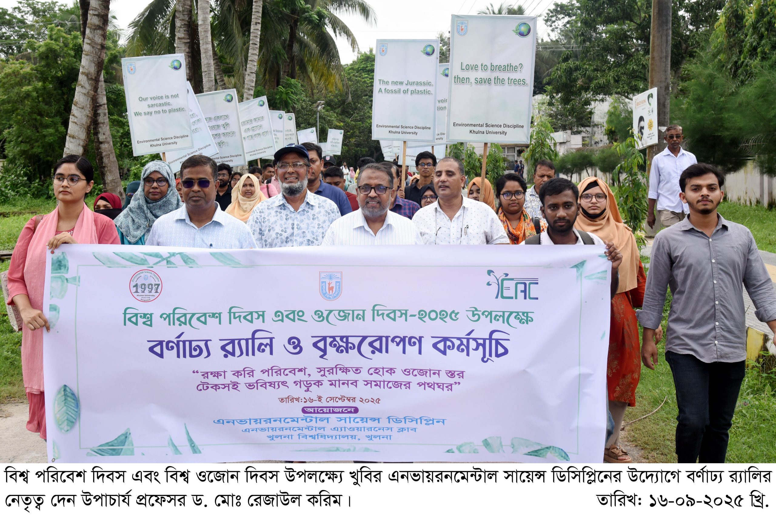 খুলনা বিশ্ববিদ্যালয়ে বিশ্ব পরিবেশ দিবস এবং বিশ্ব ওজোন দিবস-২০২৫ উপলক্ষ্যে বর্ণাঢ্য র্যালি ও বৃক্ষরোপণ কর্মসূচি অনুষ্ঠিত হয়েছে। আজ ১৬ সেপ্টেম্বর (মঙ্গলবার) সকালে বিশ্ববিদ্যালয়ের এনভায়রনমেন্টাল সায়েন্স (ইএস) ডিসিপ্লিনের উদ্যোগে এ কর্মসূচির আয়োজন করা হয়।