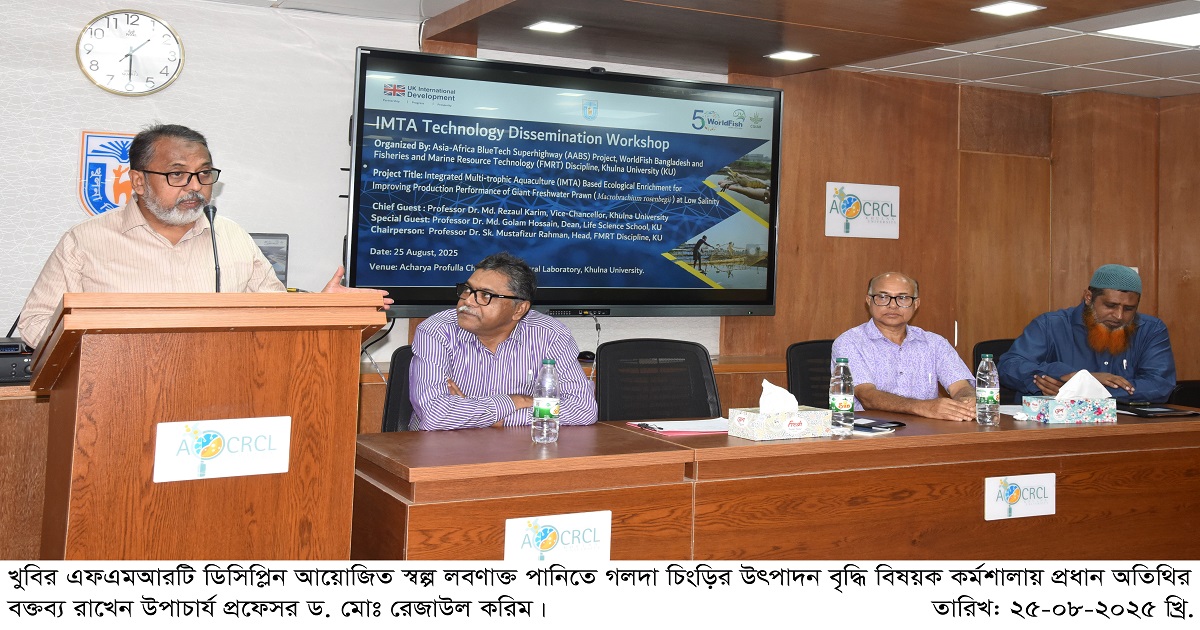 খুলনা বিশ্ববিদ্যালয়ের ফিশারিজ এন্ড মেরিন রিসোর্স টেকনোলজি (এফএমআরটি) ডিসিপ্লিনে পরিচালিত “ইন্টিগ্রেটেড মাল্টি-ট্রফিক অ্যাকুয়াকালচার (আইএমটিএ) বেইজড ইকোলজিক্যাল এনরিচমেন্ট ফর ইমপ্রুভিং প্রোডাকশন পারফরম্যান্স অব জায়ান্ট ফ্রেশওয়াটার প্রন (ম্যাক্রোব্রাকিয়াম রোজেনবার্গি) অ্যাট লো স্যালাইনিটি” শীর্ষক গবেষণার ফলাফল উপস্থাপন বিষয়ে এক কর্মশালা আজ ২৫ আগস্ট (সোমবার) অনুষ্ঠিত হয়েছে। ওয়ার্ল্ডফিশের এশিয়া-আফ্রিকা ব্লুটেক সুপারহাইওয়ে প্রজেক্টের অর্থায়নে এ গবেষণা পরিচালিত হয়।