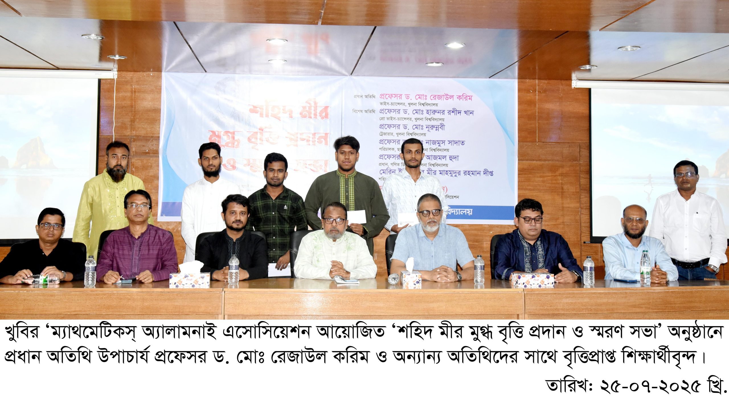 খুলনা বিশ্ববিদ্যালয়ের গণিত ডিসিপ্লিনের ‘ম্যাথমেটিকস্ অ্যালামনাই এসোসিয়েশন’ এর উদ্যোগে শহিদ মীর মুগ্ধ বৃত্তি প্রদান ও স্মরণ সভা আজ ২৫ জুলাই (শুক্রবার) সকাল ১০টায় ইউআরপি লেকচার থিয়েটারে অনুষ্ঠিত হয়। অনুষ্ঠানে প্রধান অতিথি হিসেবে বক্তব্য রাখেন উপাচার্য প্রফেসর ড. মোঃ রেজাউল করিম।