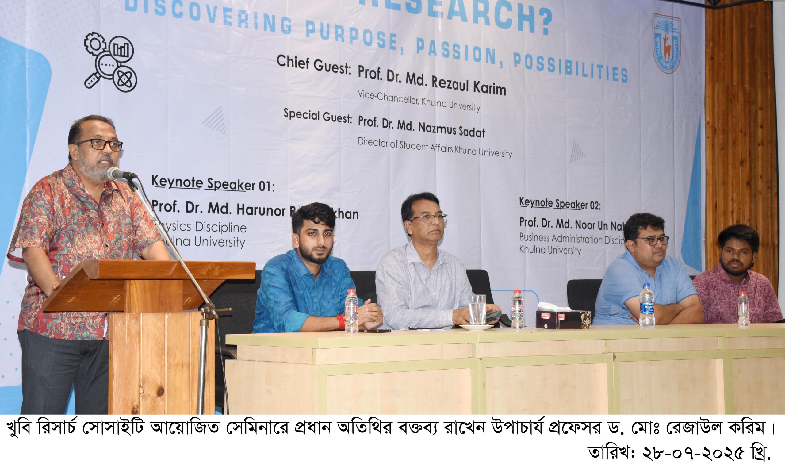 খুলনা বিশ্ববিদ্যালয় রিসার্চ সোসাইটির উদ্যোগে 'Why Research?: Discovering Purpose, Passion, Possibilities' শীর্ষক এক সেমিনার অনুষ্ঠিত হয়েছে। আজ ২৮ জুলাই (সোমবার) দুপুর ৩টায় বিশ্ববিদ্যালয়ের সাংবাদিক লিয়াকত আলী মিলনায়তনে আয়োজিত এ সেমিনারে প্রধান অতিথি হিসেবে বক্তব্য রাখেন উপাচার্য প্রফেসর ড. মোঃ রেজাউল করিম।