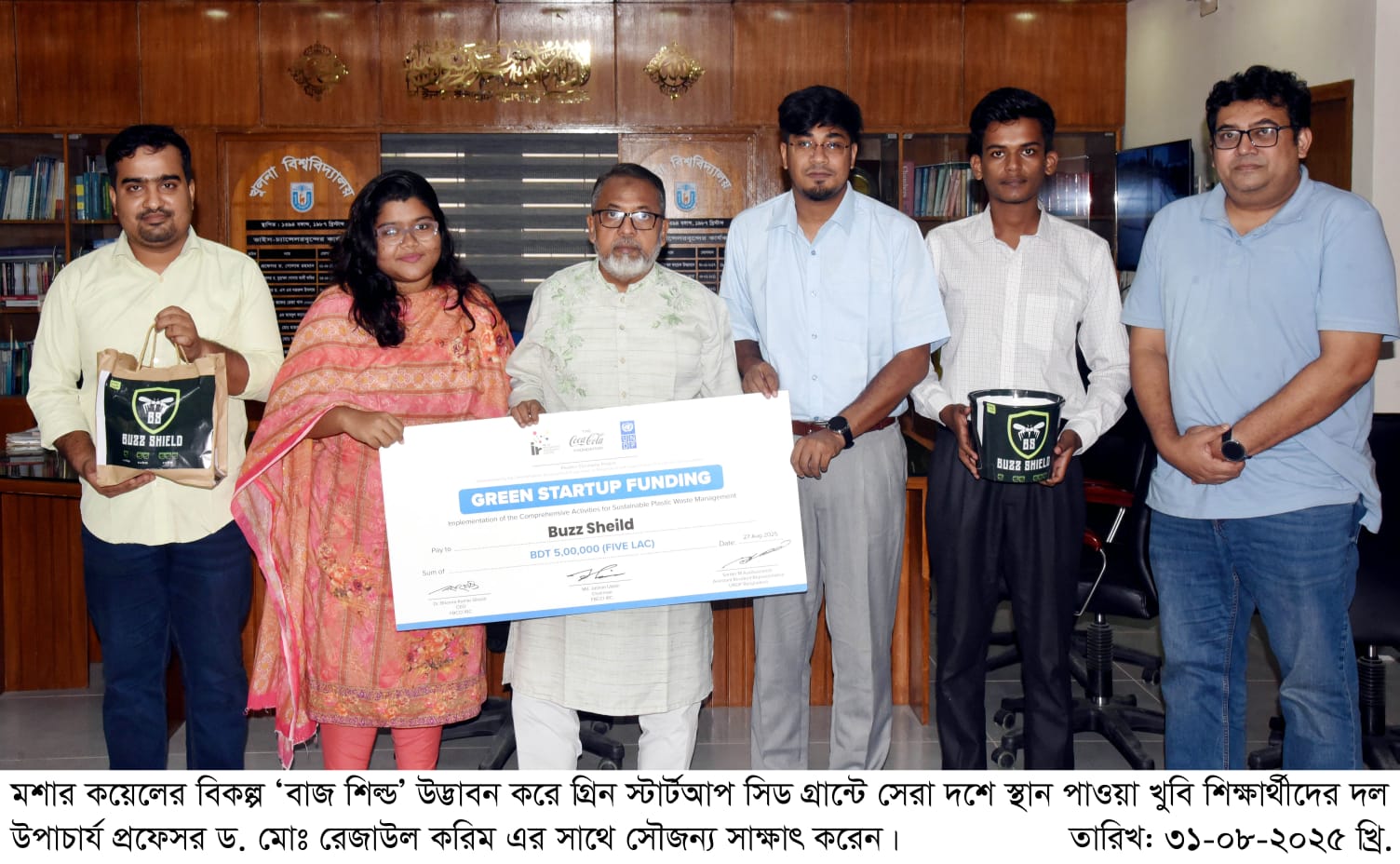 মশার কয়েলের বিকল্প ‘বাজ শিল্ড’ উদ্ভাবন করে গ্রিন স্টার্টআপ সিড গ্রান্ট প্রতিযোগিতায় বিজয়ী টিম হিসেবে সেরা দলে স্থান করে নিয়েছে খুলনা বিশ্ববিদ্যালয়ের একঝাঁক তরুণ শিক্ষার্থীদের দল। সম্প্রতি এফবিসিসিআই ইনোভেশন অ্যান্ড রিসার্চ সেন্টার (এফবিসিসিআই আইআরসি) ও জাতিসংঘ উন্নয়ন কর্মসূচি (ইউএনডিপি) আয়োজিত এ প্রতিযোগিতায় সারাদেশ থেকে নির্বাচিত সেরা দশ দলের একটি হলো খুলনা বিশ্ববিদ্যালয়ের এ দলটি।