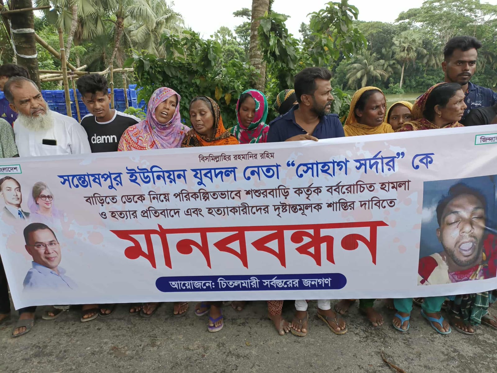 চিতলমারী উপজেলার সন্তোষপুর ইউনিয়নের আদিখালী কাঠিপাড়া গ্রামে বিষপানে যুবদল কর্মী সোহাগ সরদারের মৃত্যুর ঘটনায় উত্তেজনা ছড়িয়ে পড়েছে। আজ শনিবার (২৬ জুলাই) বিকেলে তার মৃত্যুর সঠিক তদন্ত ও বিচার দাবিতে এলাকাবাসীর উদ্যোগে এক বিশাল মানববন্ধন অনুষ্ঠিত হয়।