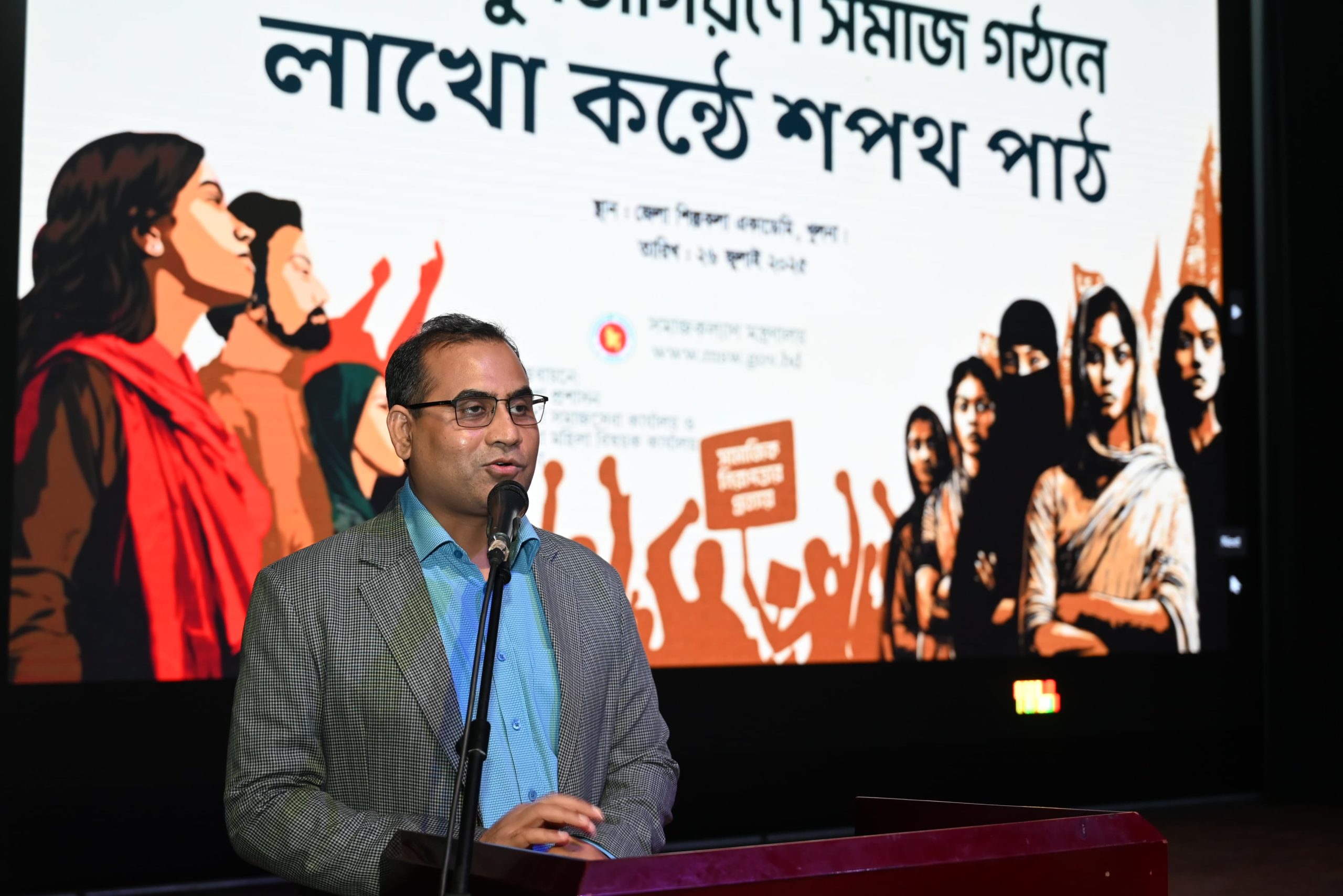 ’২৪ এর জুলাই অভ্যুত্থানের বর্ষপূর্তীতে মাসব্যাপী ‘জুলাই পুনর্জাগরণ’ শীর্ষক অনুষ্ঠানমালার ধারাবাহিকতায় সমাজকল্যাণ ও মহিলা ও শিশু বিষয়ক মন্ত্রণালয়ের যৌথ উদ্যোগে আজ শনিবার জেলা শিল্পকলা একাডেমিতে দুটি পর্বে অনুষ্ঠিত হয়।