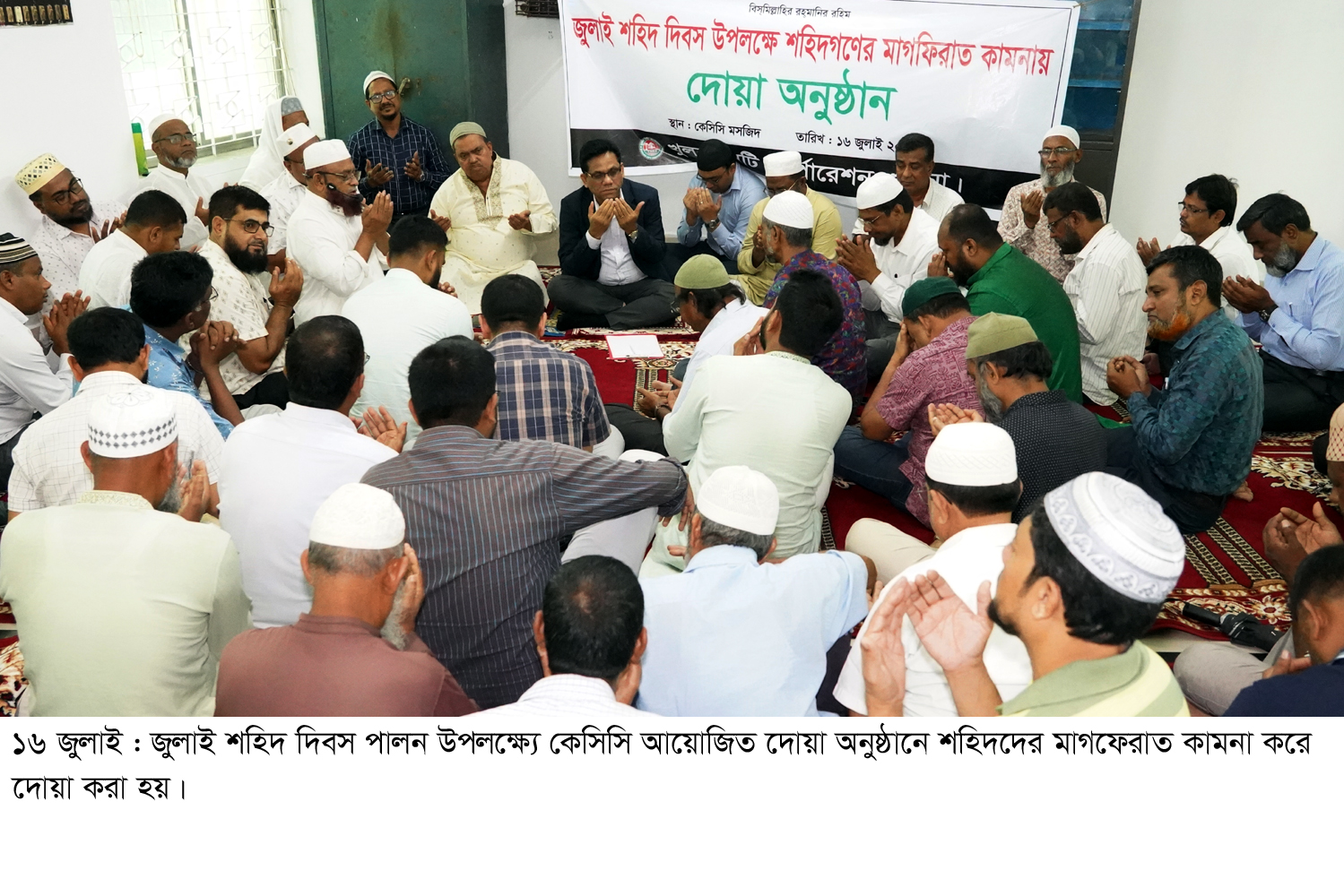 কেসিসি প্রশাসক আজ বুধবার বাদ জোহর নগর ভবন মসজিদে জুলাই শহিদদের মাগফেরাত কামনায় আয়োজিত দোয়া অনুষ্ঠানে প্রধান অতিথির বক্তৃতায় এ কথা বলেন। জুলাই শহিদ দিবস পালন উপলক্ষ্যে খুলনা সিটি কর্পোরেশনের পক্ষ থেকে এ দোয়া অনুষ্ঠানের আয়োজন করা হয়। অনুষ্ঠানে জুলাই আন্দোলনে শহিদদের আত্মার মাগফেরাত কামনা করে দোয়া করা হয়।