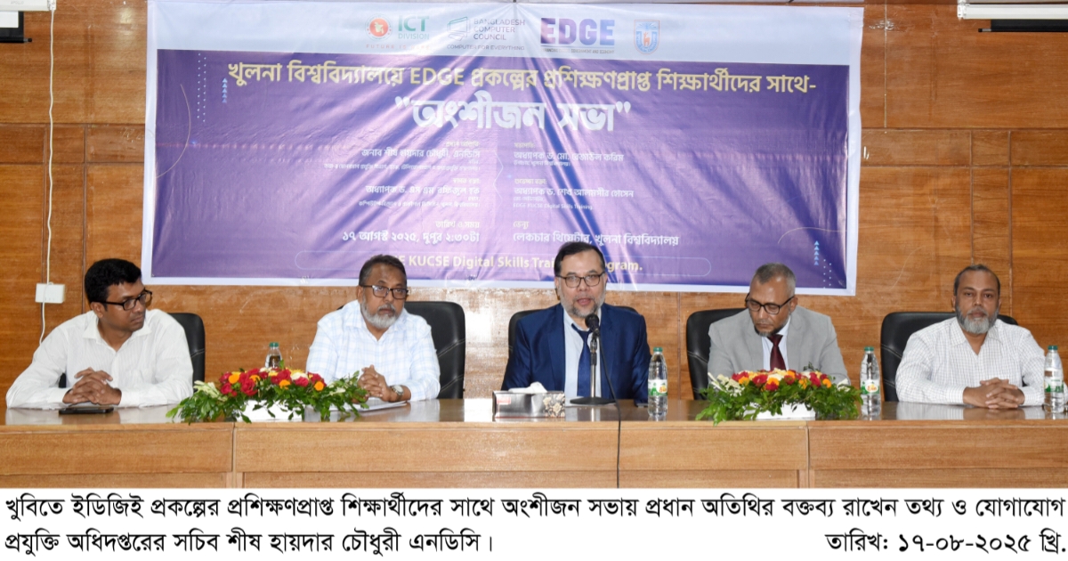 আজ ১৭ আগস্ট (রবিবার) বিকালে খুলনা বিশ্ববিদ্যালয়ের ইউআরপি লেকচার থিয়েটারে ডিজিটাল সরকার ও অর্থনীতি শক্তিশালীকরণ (ইডিজিই) প্রকল্পের প্রশিক্ষণপ্রাপ্ত শিক্ষার্থীদের সাথে অংশীজন সভায় প্রধান অতিথির বক্তব্যে তিনি এসব কথা বলেন।
