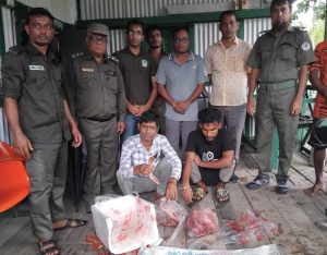 পূর্ব সুন্দরবন থেকে হরিণের  মাংস পাচার করে নিয়ে যাবার পথে বৃহস্পতিবার সকালে   মাংস সহ দুইজন বনরক্ষীদের  হাতে আটক হয়েছে । আটককৃতদের বৃহস্পতিবার দুপুরে বাগেরহাট আদালতে চালান দেওয়া হয়েছে।