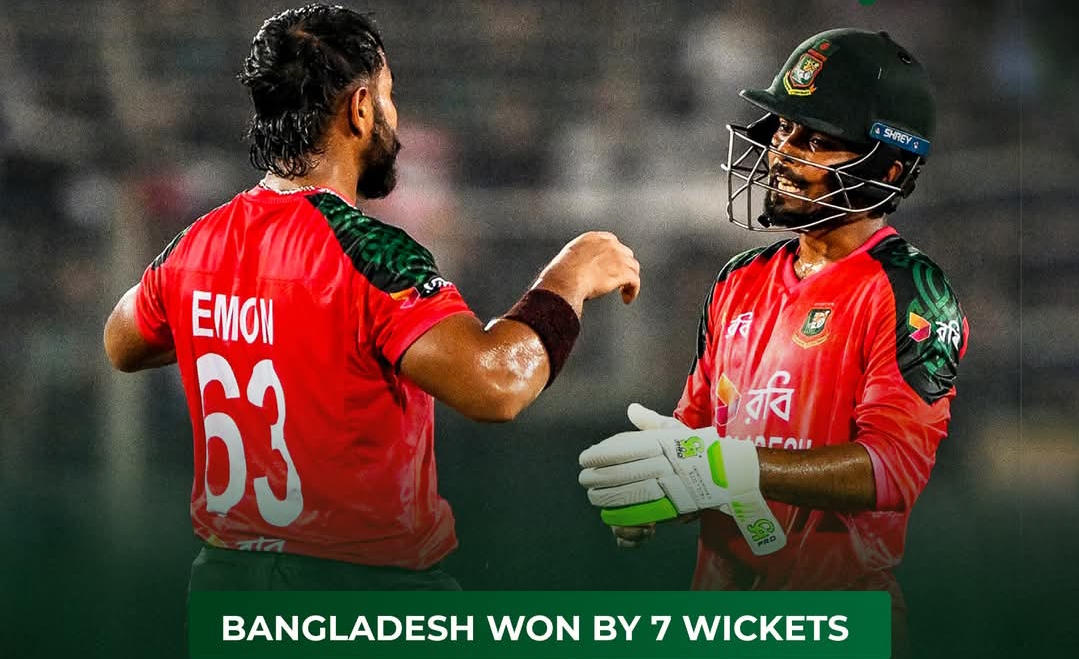 মিরপুরে জমজমাট লড়াইয়ে দুর্দান্ত বোলিং ও আত্মবিশ্বাসী ব্যাটিংয়ে ৭ উইকেটের জয় তুলে নিয়েছে বাংলাদেশ দল। তাসকিন আহমেদের দুর্দান্ত স্পেল আর ইমনের ব্যাটে ভর করেই ঘরের মাঠে শুরুটা দারুণ করল লিটন দাসের দল।