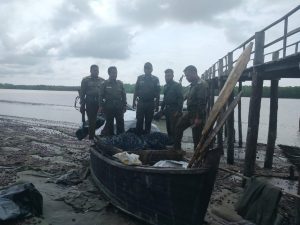 শরণখোলাঃ পুর্ব সুন্দরবনের কটকা অভয়ারণ্য কেন্দ্রের বনরক্ষীরা শনিবার ভোর রাতে ট্রলারসহ বিপুল পরিমাণ হরিণধরা মালা ফাঁদ জব্দ করেছেন। (সংগৃহীত)।#