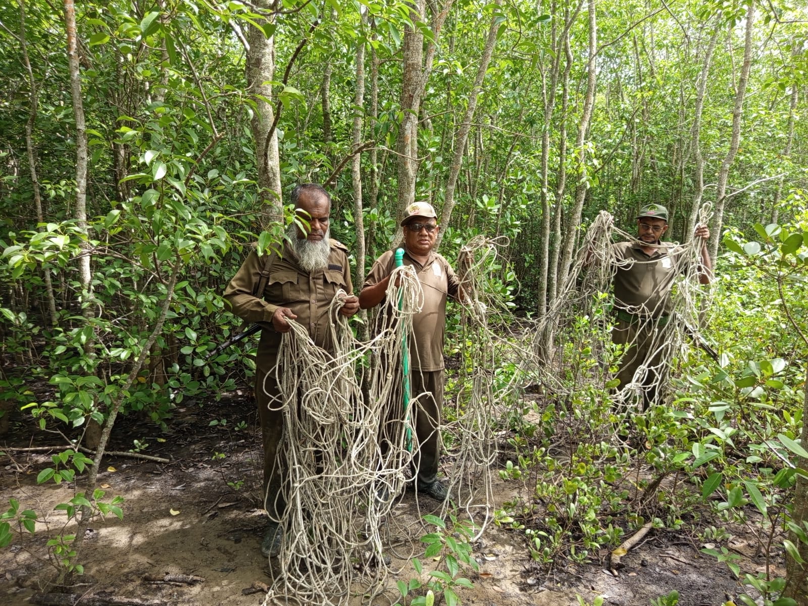 একদিনের ব্যবধানে পূর্ব সুন্দরবনের ছাপড়াখালিতে ফের উদ্ধার হয়েছে বিপুল পরিমাণ হরিণ ধরা ফাঁদ। মঙ্গলবার বিকেলে বনরক্ষীরা শরণখোলা রেঞ্জের শেলারচর টহল ফাঁড়ির ছাপড়াখালি এলাকার বন্দেআলী খালসংলগ্ন সুন্দরবন থেকে বিপুল পরিমাণ হরিণ ধরার নাইলনের ফাঁদ উদ্ধার করেছেন।বন বিভাগ সূত্রে জানা যায়, মঙ্গলবার (১ জুলাই) দুপুরে শেলারচর ফরেস্ট টহল ফাঁড়ির ভারপ্রাপ্ত কর্মকর্তা ফরেস্টার আব্দুস সবুরের নেতৃত্বে বনরক্ষীরা গোপন সংবাদের ভিত্তিতে ছাপড়াখালি হতে বন্দে আলী খাল পর্যন্ত হেঁটে টহলের সময় সুন্দরবনের মধ্যে পেতে রাখা প্রায় ২৫ কেজি হরিণ ধরা নাইলনের ফাঁদ উদ্ধার করেন। এ সময় বনরক্ষীরা ঘটনাস্থলে হরিণ শিকারিদের তৈরি করা একটি টংমাচা ধ্বংস করেন। বনরক্ষীদের উপস্থিতির টের পেয়ে শিকারিরা গহীন বনে পালিয়ে যায়। এর আগে ৩০ শে জুন সকালে সুন্দরবনের কচি খালির সুখপাড়া এলাকার সুন্দরবন থেকে ফাঁদসহ একজন শিকারীকে আটক করে শরণখোলা রেঞ্জের স্মার্ট টিমের বনরক্ষীরা।