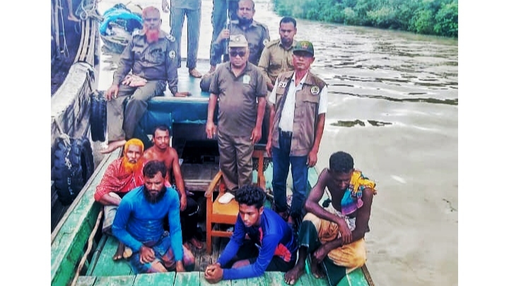 শরণখোলাঃ পূর্ব সুন্দরবনের শেলারচরে মঙ্গলবার দুপুরে বনরক্ষীরা পাঁচ জেলেকে আটক করে। (ছবি সংগৃহীত)#