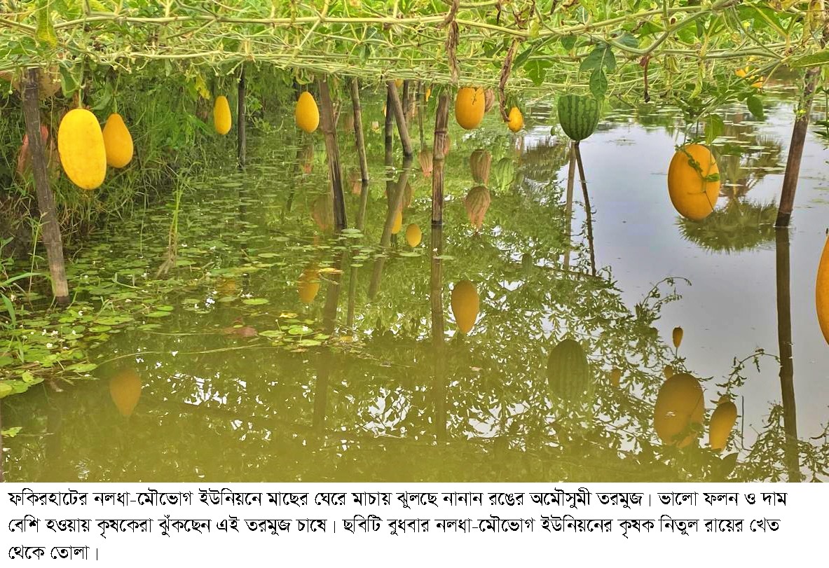 বাগেরহাটের ফকিরহাটে মাছের ঘেরে সারি সারি গাছে ঝুলছে হলুদ, সবুজ ও কালো বর্ণের অমৌসুমী তরমুজ। কৃষির নতুন এ উদ্যোগ দৃষ্টি কেড়েছে কৃষক ও উৎসুক ভোক্তাদের। আর্থিকভাবে লাভজনক হওয়ায় তরমুজ চাষে ঝুঁকছেন অনেক কৃষক। উপজেলা কৃষি বিভাগের নিয়মিত পরামর্শ ও তত্ত্বাবধানে গড়ে উঠেছে এ অমৌসুমী তরমুজ চাষ।