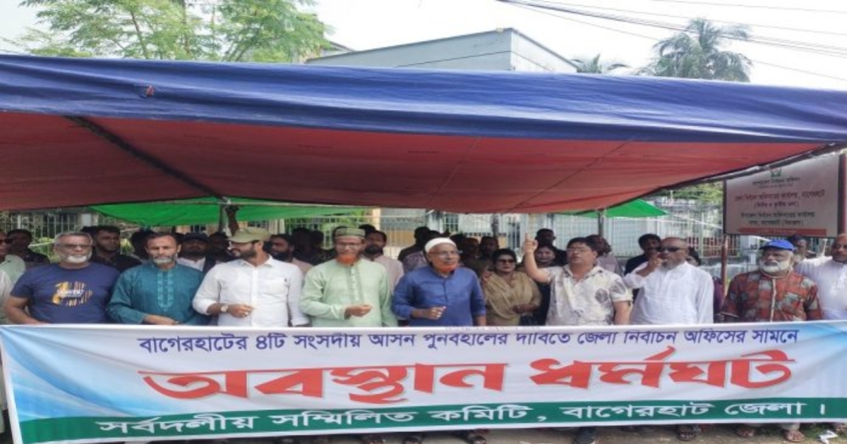 বাগেরহাটে চারটি সংসদীয় আসন বহালের দাবিতে আবারো অবস্থান ধর্মঘট ও বিক্ষোভ কর্মসূচি পালন করেছে সর্বদলীয় সম্মিলিত কমিটি। দু’দিন বিরতির পর রবিবার (২১ সেপ্টেম্বর) সকালে জেলা নির্বাচন অফিসের সামনে তাবু টানিয়ে অবস্থান নেন বিএনপি জামায়াতসহ সংগঠনটির সর্বদলীয় সম্মিলিত কমিটির বিপুল সংখক নেতাকর্মীরা। এর আগে তারা সড়কে বিক্ষোভ মিছিল করেন। এছাড়াও একই দাবিতে জেলার ৯টি উপজেলা নির্বাচন অফিসের সামনে সকাল ৯টা থেকে দুপুর ১টা পর্যন্ত অবস্থান ধর্মঘট ও বিক্ষোভ কর্মসূচি পালন করে বিএনপি জামায়াতসহ সংগঠনটির সর্বদলীয় সম্মিলিত কমিটির নেতাকর্মীরা ফলে সকাল থেকে দুপুর ১টা পর্যন্ত নির্বাচন সংশ্লিষ্ট কর্মকর্তা-কর্মচারীদের অফিসে প্রবেশ করতে পারেনি। আধাবেলা বন্ধ থাকে জেলা সব নির্বাচন অফিসের দৈনন্দিক কর্মকান্ডসহ নাগরিক সেবা। এই কর্মসূচিকে কেন্দ্র করে জেলার সব নির্বাচর অফিসে নেয়া হয় পর্যাপ্ত নিরাপত্তা ব্যবস্থা। পূর্ব ঘোষিত কর্মসূচির অংশ হিসেবে আজও (সোমবার) বাগেরহাট জেলা ও উপজেলার সব নির্বাচন অফিসের সামনে অবস্থান ধর্মঘট ও বিক্ষোভ কর্মসূচি পালন করেছে সর্বদলীয় সম্মিলিত কমিটি। সর্বদলীয় সম্মিলিত কমিটি নেতারা জানান, দুর্গাপূজার কারণে হরতাল-অবরোধ কর্মসূচি স্থগিত রাখা হলেও এখন থেকে নির্বাচন অফিসের সামনে অবস্থান ও বিক্ষোভ অব্যাহত থাকবে।
