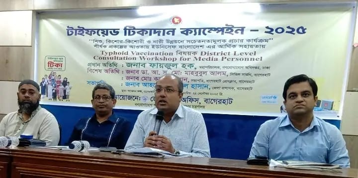 বাগেরহাটে টাইফয়েড টিকাদান বিষয়ে গণমাধ্যম কর্মীদের জন্য জেলা পর্যায়ের পরামর্শ কর্মশালা অনুষ্ঠিত হয়েছে। শিশু, কিশোর-কিশোরী ও নারী উন্নয়নে সচেতনতামূলক প্রচার কার্যক্রম শীর্ষক প্রকল্পের আওতায় এবং ইউনিসেফ বাংলাদেশের আর্থিক সহায়তায় কর্মশালাটি অনুষ্ঠিত হয়। বুধবার (২৪ সেপ্টেম্বর) সকালে বাগেরহাট প্রেসক্লাবের সম্মেলন কক্ষে জেলা তথ্য অফিসের আয়োজনে ভার্চুয়ালি এই কর্মশালার উদ্বোধন করেন গণযোগাযোগ অধিদপ্তরের মহাপরিচালক ফায়জুল হক।
