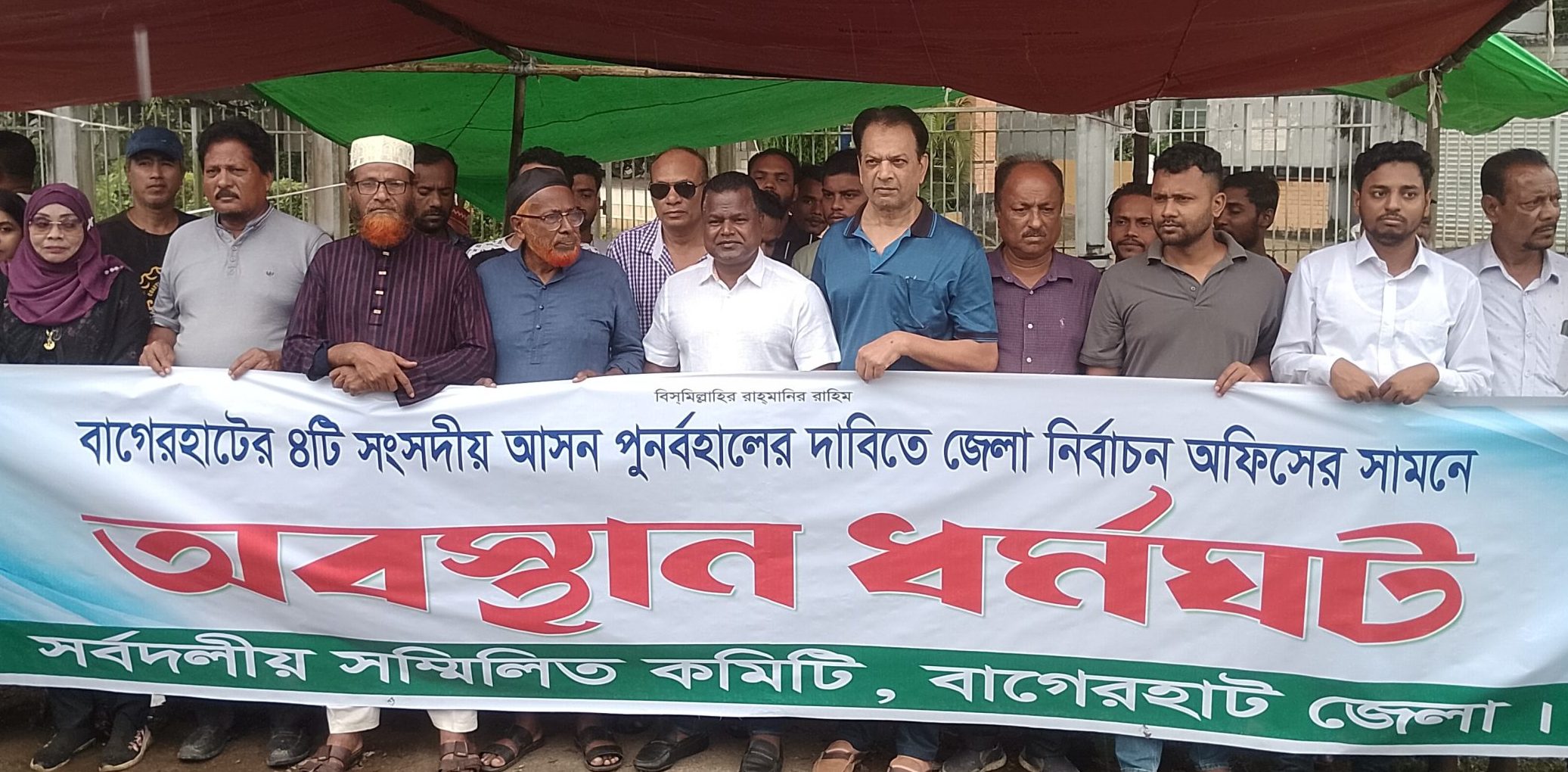 বাগেরহাটে চারটি সংসদীয় আসন বহালের দাবিতে পঞ্চম দিনের মতো সকাল ৯টা থেকে দুপুর ১টা পর্যন্ত অবস্থান ধর্মঘট ও বিক্ষোভ কর্মসূচি পালন করেছে সর্বদলীয় সম্মিলিত কমিটি। সোমবার সকালে জেলা নির্বাচন অফিসের সামনে অবস্থান নেন বিএনপি জামায়াতসহ সংগঠনটির সর্বদলীয় সম্মিলিত কমিটির নেতাকর্মীরা। এর আগে তারা সড়কে বিক্ষোভ মিছিল করেন। জেলার ৯টি উপজেলা নির্বাচন অফিসের সামনেও অবস্থান ধর্মঘট ও বিক্ষোভ কর্মসূচি পালন করে বিএনপি জামায়াতসহ সংগঠনটির সর্বদলীয় সম্মিলিত কমিটির নেতাকর্মীরা। ফলে সকাল থেকে দুপুর ১টা পর্যন্ত নির্বাচন সংশ্লিষ্ট কর্মকর্তা-কর্মচারীদের অফিসে প্রবেশ করতে পারেনি। ফলে আধাবেলা বন্ধ থাকে জেলা সব নির্বাচন অফিসের দৈনন্দিক কর্মকান্ডসহ নাগরিক সেবা। এদিকে একই দাবি আদায়ে মঙ্গলবার জেলাব্যাপী গণস্বাক্ষর সংগ্রহ শুরু ও বুধ-বৃহস্পতিবার দুই দিন জেলা-উপজেলার ১০টি নির্বাচন অফিসের সামনে সকাল ৯টা থেকে দুপুর ১টা পর্যন্ত অবস্থান ধর্মঘট ও বিক্ষোভে নতুন কর্মসূচির ঘোষণা করেছে সর্বদলীয় সম্মিলিত কমিটি। সর্বদলীয় সম্মিলিত কমিটির আহবায়ক ও জেলা বিএনপির সাবেক সভাপতি এম এ সালাম দুপুরে জেলা নির্বাচন অফিসের সামনে নতুন এই কর্মসূচির ঘোষণা দেন। তিনি বলেন, দুর্গাপূজার কারণে হরতাল-অবরোধ কর্মসূচি স্থগিত রাখা হলেও এখন থেকে জেলার সব নির্বাচন অফিসের সামনে অবস্থান ধর্মঘট, বিক্ষোভ ও জেলাব্যাপী গণস্বাক্ষর সংগ্রহ অব্যাহত থাকবে। এই সময়ের মধ্যে দাবি আদায় না হলে প্রয়োজনে দুর্গা পূজার পর লাগাতার হরতাল মহাসড়ক অবরোধসহ কঠোর কর্মসূচি দেওয়া হবে বলেও জানান তিনি।