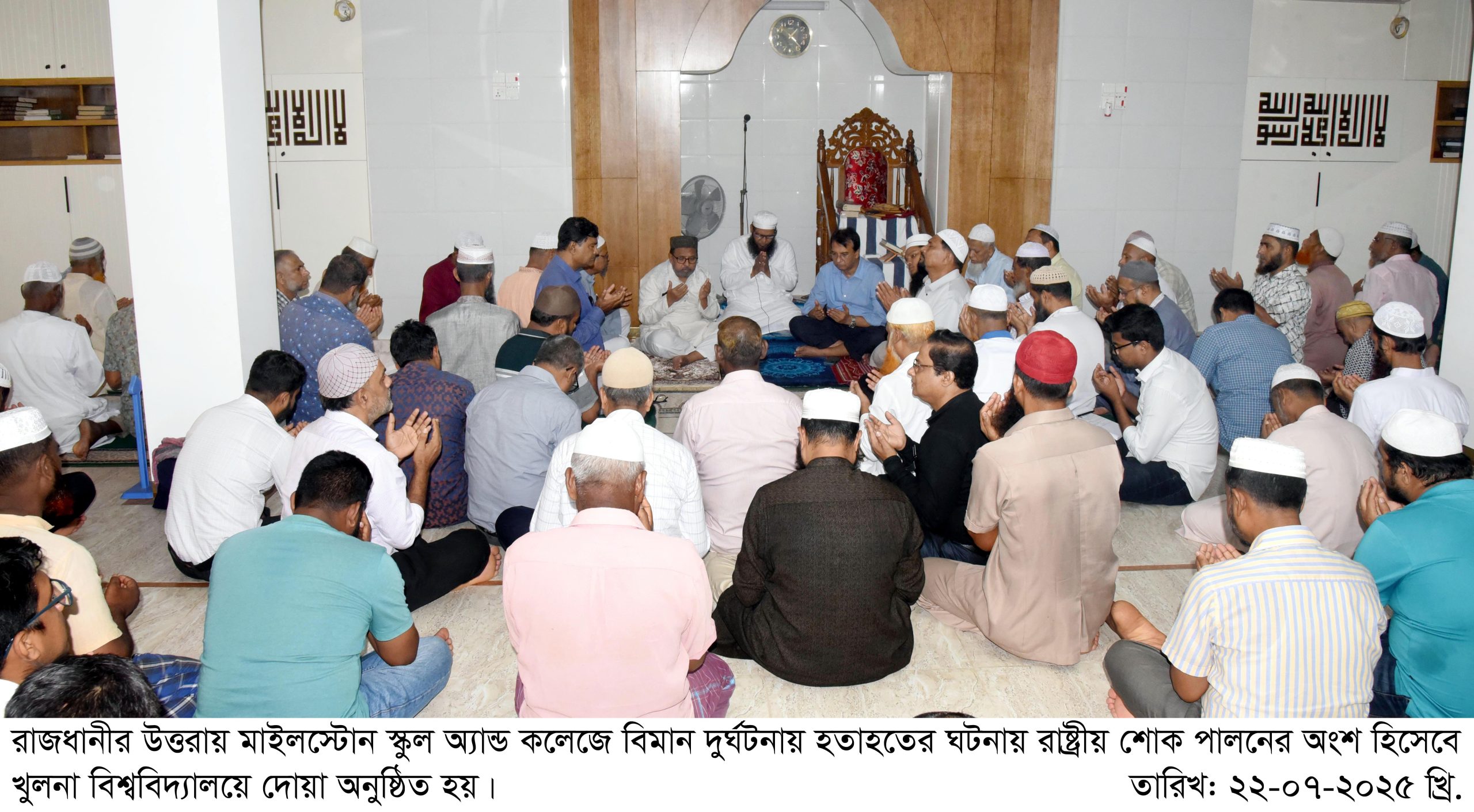রাজধানীর উত্তরায় মাইলস্টোন স্কুল অ্যান্ড কলেজ ভবনের ওপর বাংলাদেশ বিমান বাহিনীর একটি প্রশিক্ষণ বিমান বিধ্বস্ত হয়ে কোমলমতি শিক্ষার্থীসহ বহু হতাহতের মর্মান্তিক ঘটনায় রাষ্ট্রীয় শোক পালনের অংশ হিসেবে খুলনা বিশ্ববিদ্যালয়ে দোয়া অনুষ্ঠিত হয়েছে।