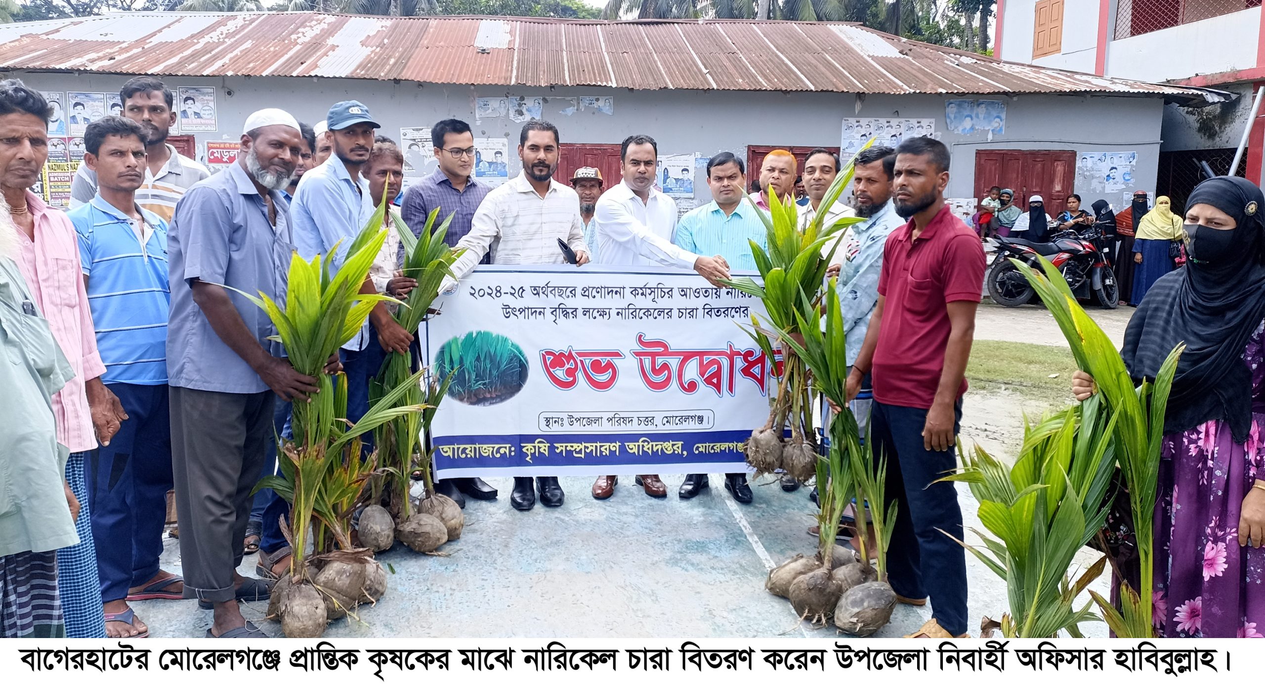 মোরেলগঞ্জে ক্ষুদ্র প্রান্তিক কৃষকদের মাঝে ১৪ শ’ নারিকেল চারা বিতরণ করা হয়েছে। রবিবার বেলা ১১টায় উপজেলা কৃষি সম্প্রসারণ অধিদপ্তরের উদ্যোগে ২০২৪-২০২৫ অর্থ বছরে প্রণোদনা কর্মসূচির আওতায় ১৬ টি ইউনিয়ন ও পৌরসভা জনপ্রতি ৫টি করে এ নারিকেল গাছের চারা বিতরনের আনুষ্ঠানিক উদ্ধোধন করেন উপজেলা নিবার্হী অফিসার হাবিবুল্লাহ। এ বিতরণ অনুষ্ঠানে বক্তৃতা করেন উপজলো সহকারি কমিশনার (ভূমি) মো. বদরুদ্দোজা, স্বাগত বক্তৃতা করেন উপজেলা কৃষি অফিসার কৃষিবিদ মো. সাইফুল ইসলাম।