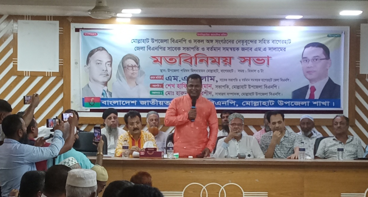 বাগেরহাটের মোল্লাহাটে উপজেলা বিএনপি ও অঙ্গ সংগঠনের নেতৃবৃন্দের সাথে জেলা বিএনপির সাবেক সভাপতি ও বর্তমান সমন্বয়ক এম এ সালামের এক মতবিনিময় সভা অনুষ্ঠিত হয়েছে। মঙ্গলবার (৩০ সেপ্টেম্বর) বিকেলে মোল্লাহাট উপজেলা পরিষদ মিলনায়তনে উপজেলা বিএনপির এ সভার আয়োজন করে।