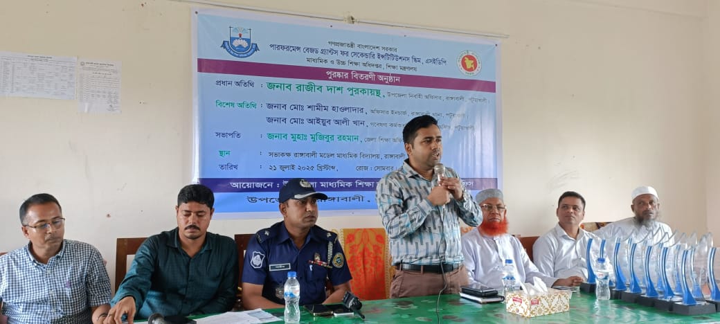 সোমবার (২১ জুলাই) সকাল ১১টার সময় উপজেলা মাধ্যমিক শিক্ষা অফিসের আয়োজনে রাঙ্গাবালী মডেল মাধ্যমিক বিদ্যালয়ের হল রুমে পটুয়াখালী জেলা শিক্ষা অফিসার মুহাম্মদ মুজিবুর রহমান এর সভাপতিত্বে অনুষ্ঠিত অনুষ্ঠানে প্রধান অতিথি ছিলেন রাঙ্গাবালী উপজেলা নির্বাহী অফিসার রাজিব দাশ পুরকায়স্থ, বিশেষ অতিথি রাঙ্গাবালী থানার অফিসার ইনচার্জ (ওসি) মো: শামীম হাওলাদার, পটুয়াখালী জেলা শিক্ষা অফিসের গবেষণা কর্মকর্তা মো: আইয়ুব আলী খান, রাঙ্গাবালী উপজেলা শিক্ষা একাডেমিক সুপার ভাইজার অনাদিকুমার বাহাদুর সহ রাঙ্গাবালী উপজেলার সকল শিক্ষা প্রতিষ্ঠানের প্রধানগন উপস্থিত ছিলেন। অনুষ্ঠানে মোট ২৮ জন শিক্ষারর্থীদের মাঝে নগদ অর্থসহ, সার্টিফিকেট ও পুরস্কার বিতরণ করা হয়।