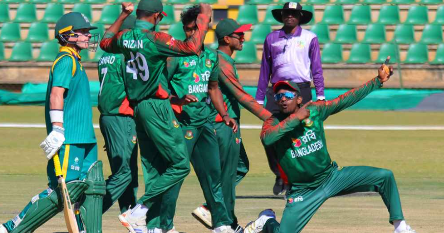 জবাবে ব্যাট করতে নেমে ৮ ওভারেই ৫৯ রান তুলে ভালো শুরু করে দক্ষিণ আফ্রিকা। তবে আল ফাহাদের জোড়া আঘাতে ম্যাচে ফিরে আসে বাংলাদেশ। প্রোটিয়ারা একাধিকবার ঘুরে দাঁড়ানোর চেষ্টা করলেও রিয়াজ হোসেনের দুর্দান্ত বোলিংয়ে শেষ পর্যন্ত ২৪৮ রানে গুটিয়ে যায় তারা। রিয়াজ একাই নেন ৫ উইকেট, আল ফাহাদ পান ৩টি এবং স্বাধীন ইসলাম ২টি উইকেট।
