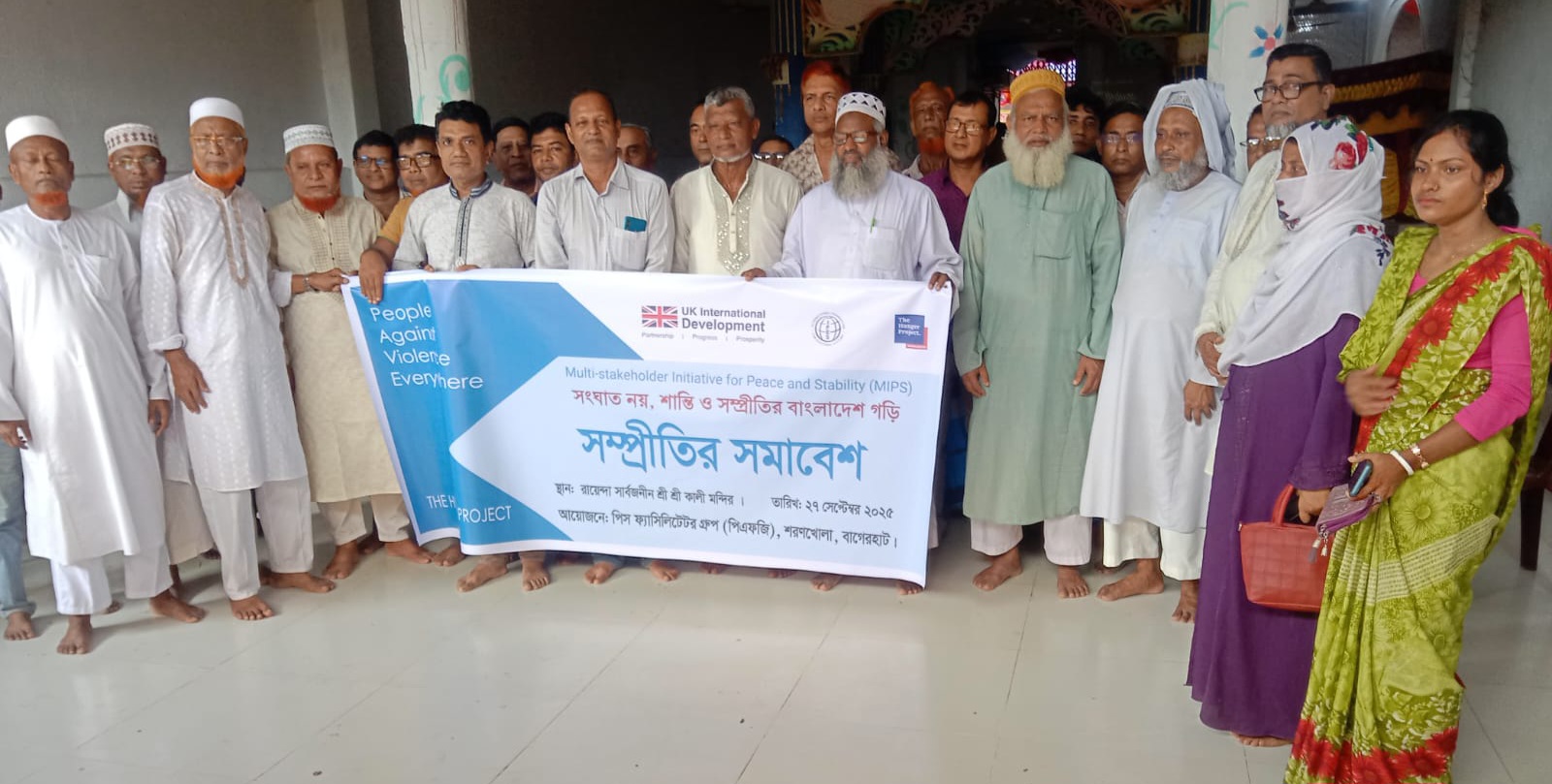 শরণখোলায় শারদীয় দুর্গাপূজা উপলক্ষে শান্তি ও সম্প্রীতি রক্ষার আহ্বানে সম্প্রীতির সমাবেশ অনুষ্ঠিত হয়েছে। শনিবার (২৭ সেপ্টেম্বর) সকালে উপজেলার ঐতিহ্যবাহী রায়েন্দা সার্বজনীন শ্রীশ্রী কালি মন্দির প্রাঙ্গণে এ সমাবেশের আয়োজন করে দি হাঙ্গার প্রজেক্টের এমআইপিএস প্রকল্পের আওতায় পিস ফ্যাসিলিটেটর গ্রুপ (পি.এফ.জি)।