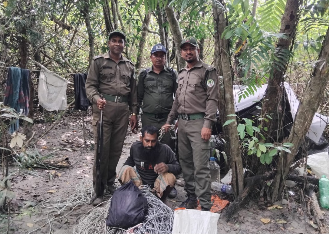 পূর্ব সুন্দরবনের কচিখালি এলাকায় সোমবার সকালে বনরক্ষীরা হরিণ ধরা ফাঁদসহ এক শিকারীকে আটক করে