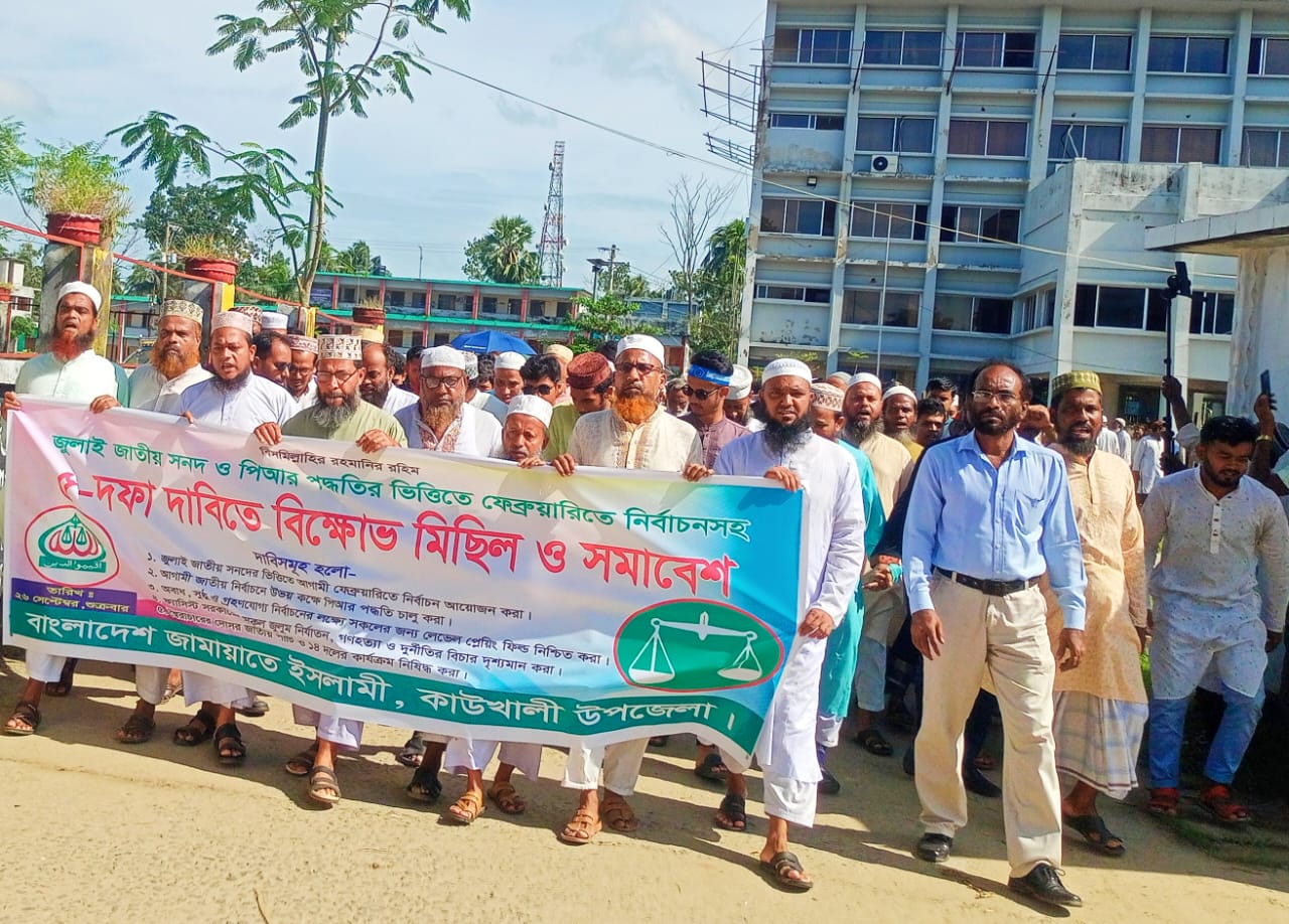 পিরোজপুরের কাউখালীতে শুক্রবার (২৬ সেপ্টেম্বর) সকাল সাড়ে নটায় বাংলাদেশ জামায়াতে ইসলামী কাউখালী উপজেলা শাখার উদ্যোগে কেন্দ্রীয় কর্মসূচি অনুযায়ী জুলাই জাতীয় সনদ ও পিআর পদ্ধতির ভিত্তিতে জাতীয় সংসদ নির্বাচন সহ পাঁচ দফা দাবিতে বিক্ষোভ মিছিল ও সমাবেশের আয়োজন করে। বিক্ষোভ মিছিলটি উপজেলা পরিষদের চত্বর থেকে শুরু করে বন্দরের বিভিন্ন গুরুত্বপূর্ণ সড়ক প্রদক্ষিণ শেষে একই স্থানে সমাবেশ অনুষ্ঠিত হয়। কাউখালী উপজেলা জামায়াতে ইসলামীর আমির মাওলানা নজরুল ইসলামের সভাপতিত্বে সমাবেশে বক্তব্য রাখেন, পিরোজপুর জেলা জামায়াতের যুগ্ম সাধারণ সম্পাদক মাওলানা সিদ্দিকুর রহমান, উপজেলা জামায়াতের সেক্রেটারি অধ্যাপক হুমায়ুন কবির, জেলা জামায়াতের নেতা মাওলানা জাকির হোসেন, কাউখালী সদর ইউনিয়ন জামায়াতের আমির টিএম রেজাউল করিম, শিয়ালকাঠি ইউনিয়নের জামায়াতের আমির মৌলভী আনোয়ার হোসেন, জামাত নেতা আব্দুর রাজ্জাক সহ বিভিন্ন নেতৃবৃন্দ বক্তব্য রাখেন।