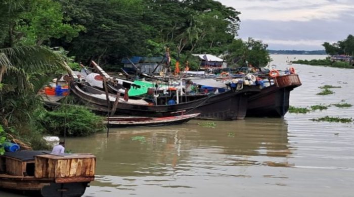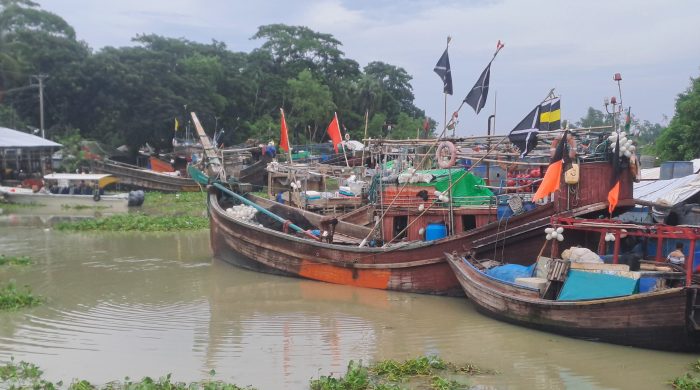 ছবির ক্যাপশন: শরণখোলা: বঙ্গোপসাগরে বৈরী আবহাওয়ায় টিকতে না পেরে ফিশিংবোটবহর ফিরে এসেছে। শরণখোলা রাজৈর মৎস্যঘাটে নোঙ্গর করে আছে বোটের বহর ।শনিবার দুপুরে তোলা ছবি।#   শরণখোলা দর্পণ প্রতিবেদনঃ বৈরী আবহাওয়ায়