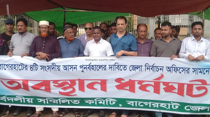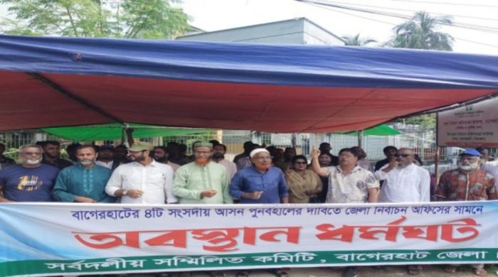বাগেরহাট  অফিস:   বাগেরহাটে চারটি সংসদীয় আসন বহালের দাবিতে আবারো অবস্থান ধর্মঘট ও বিক্ষোভ কর্মসূচি পালন করেছে সর্বদলীয় সম্মিলিত কমিটি। দু’দিন বিরতির পর রবিবার (২১ সেপ্টেম্বর) সকালে জেলা নির্বাচন অফিসের