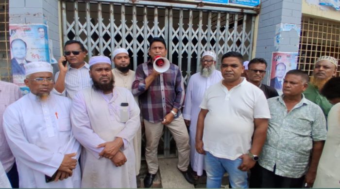 শরণখোলায় ইউএনও অফিসের গেটে তালা দিয়ে সর্বদলীয় ঐক্যের  সমাবেশে বক্তব্য রাখছেন শরণখোলা উপজেলা বিএনপি’র সভাপতি মোঃ আনোয়ার হোসেন পঞ্চায়েত।     ষ্টাফ রিপোর্টার:    শরণখোলায় ৪৮ ঘণ্টার সর্বাত্মক হরতালে শরণখোলা