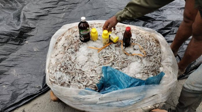ছবির ক্যাপশনঃ শরণখোলাঃ পুর্ব সুন্দরবনের খালে কিটনাশক দিয়ে ধরা বিপুল পরিমাণ চিংড়ি জব্দ করেন বনরক্ষীরা । শরণখোলা দর্পণ প্রতিবেদনঃ পূর্ব সুন্দরবনে চলছে বনরক্ষীদের সাড়াশি অভিযান। অভিযানের মধ্যেও থেমে নেই অবৈধভাবে